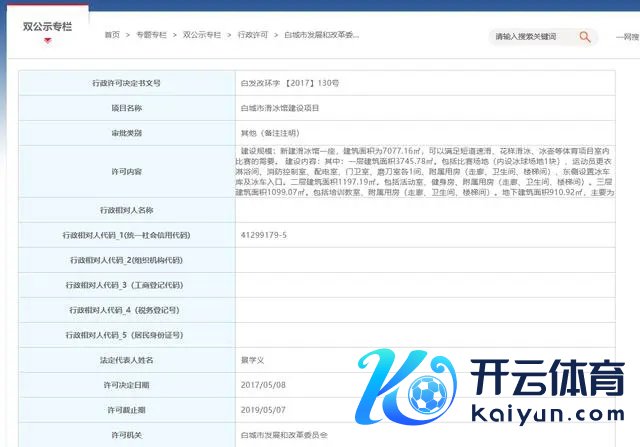 记者详确到,在当地政府官方网站上,相对于该项目建筑行政许可相干材料:白首改环字 【2017】130号透露:白城市溜冰馆建筑项见识许可单元为白城市发展和改革委员会,许可决定日历为2017年05月08日,建筑范围为:新建溜冰馆一座,建筑面积为7077.16㎡,不错得志短谈速滑、技俩溜冰、冰壶等体育项目室内比赛的需要。