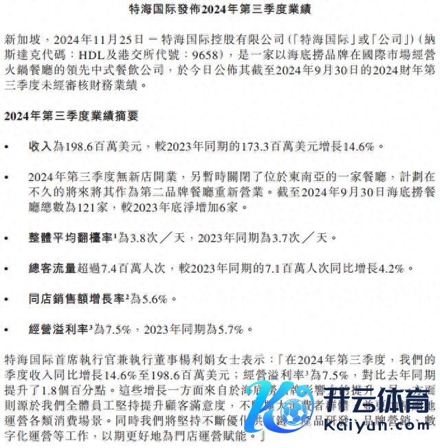 [公共网花消报谈记者文馨]特海国际发布的2024年第三季度财报走漏,营收和利润率双增长,同期海底捞推出冬季新品开云体育,进一步丰富花消者遴荐,普及品牌影响力。