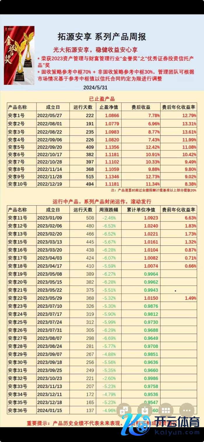 凭据多名投资者提供的斟酌居品推介材料和相信左券条目,光大相信安享系列、睿享系列等居品自5月31日出现十分的大幅净值回撤后,住手更新净值。