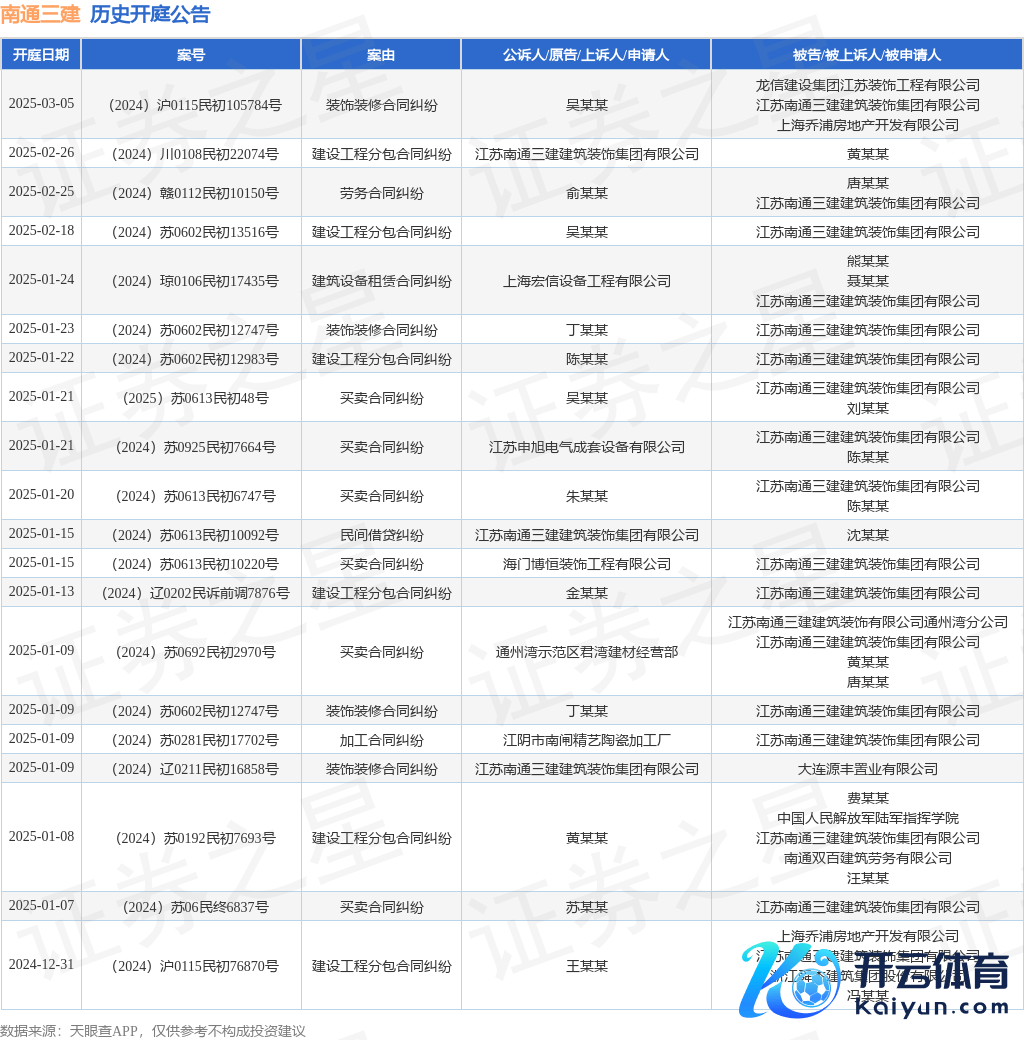 本站音讯,凭证天眼查APP露馅,近日公布了一则江苏南通三建树立遮挡集团有限公司动作被告/被上诉东谈主的开庭公告,庄重践诺如下: