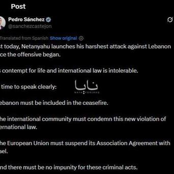 西班牙首相佩德罗·桑切斯刚刚发帖称:内塔尼亚胡发动了自攻势启动以来对黎巴嫩最狠恶的挫折。他对人命和国外法的轻茂令东谈主无法容忍。是本领把话说了了了,黎巴嫩必须成为停战契约的一部分。欧盟应暂停与以色列的勾通契约。关于这些违警看成开云体育,毫不应有法外之地。