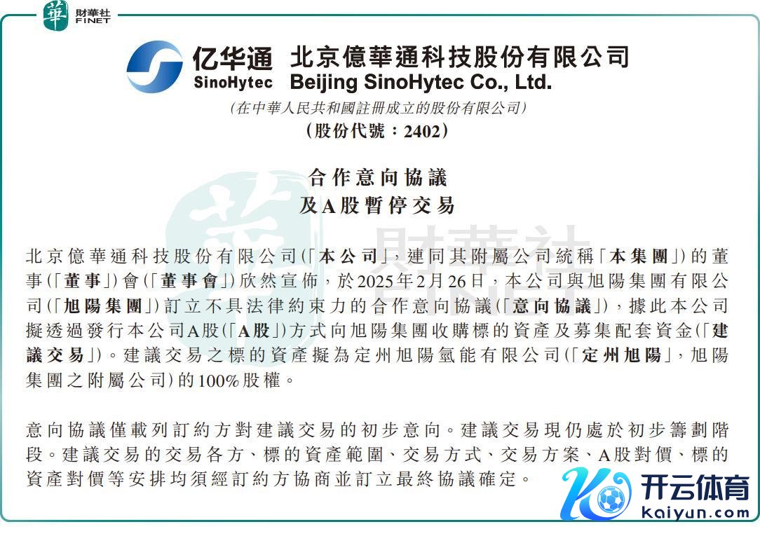 音信面,2月27日,亿华通发布公告告示,已于前一天(2月26日)与旭阳集团签订不具法律拘谨力的合营意向合同。确认合同,公司拟透过刊行其A股款式,向旭阳集团收购“定州旭阳”100%股权及召募配套资金。