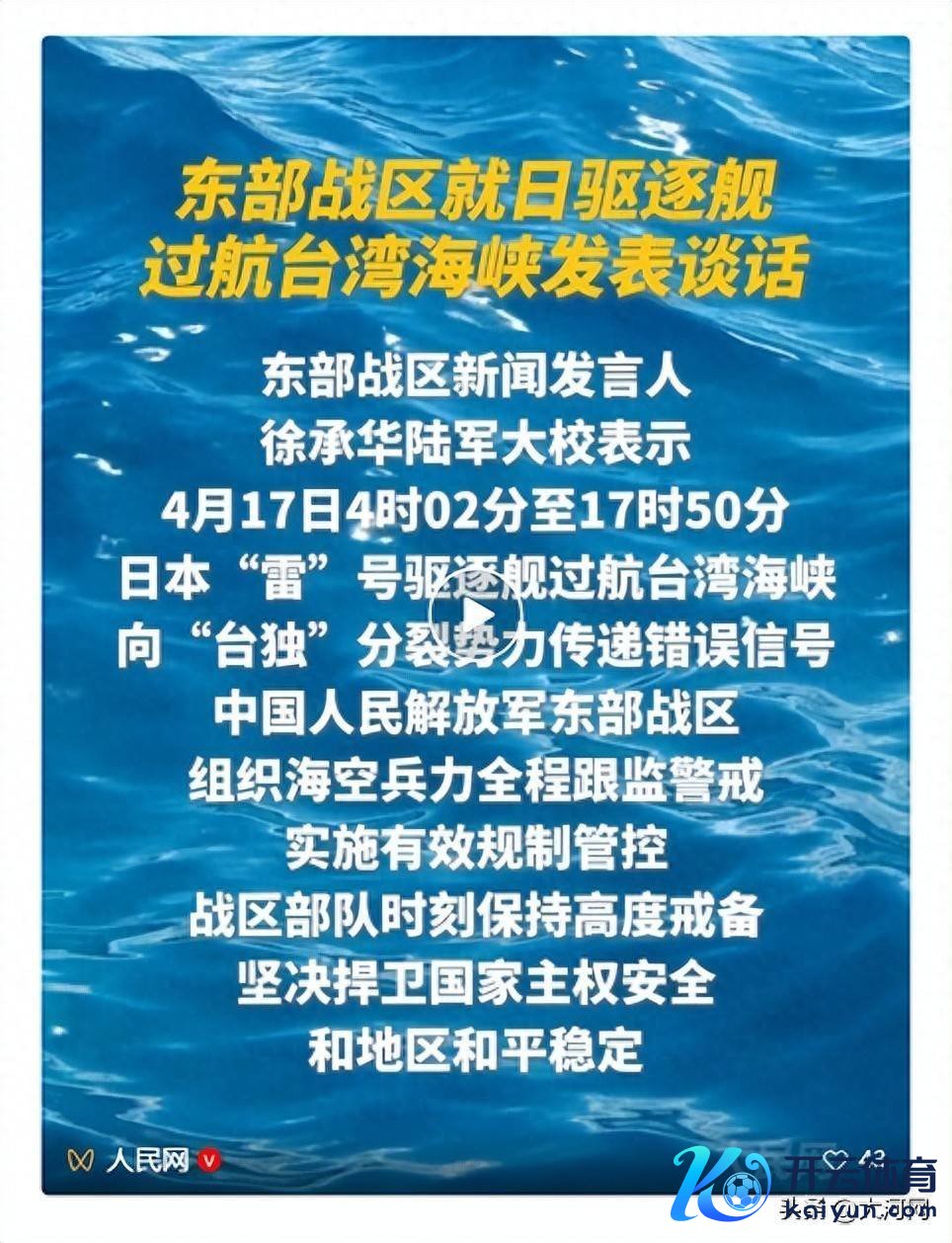 东部战区新闻发言东说念主徐承华陆军大校示意,4月17日4时02分至17时50分,日本“雷”号完了舰过航台湾海峡,向“台独”诀别势力传递无理信号,中国东说念主民摆脱军东部战区组织海空军力全程跟监警戒,实践灵验规制管控。战区戎行本领保握高度防备,坚贞捍卫国度主权安全和地区和平雄厚。